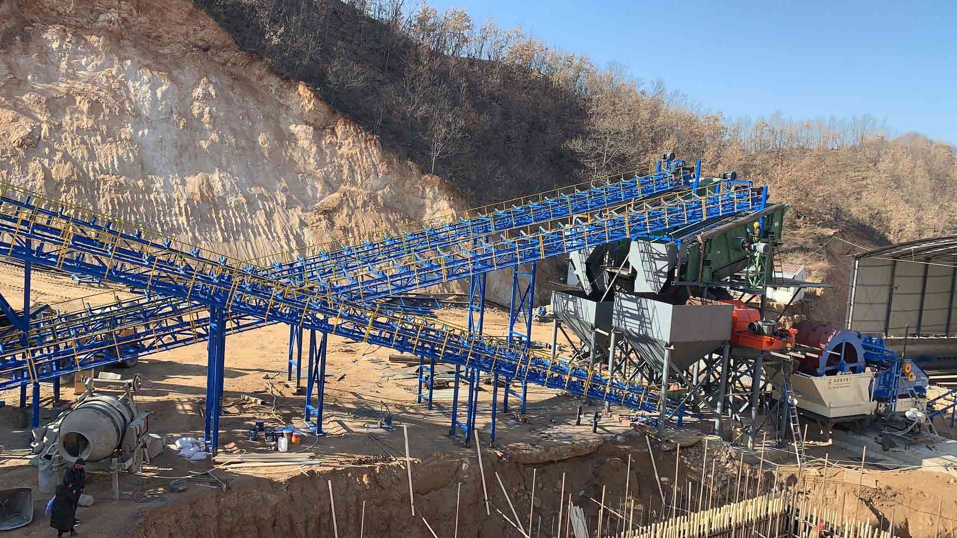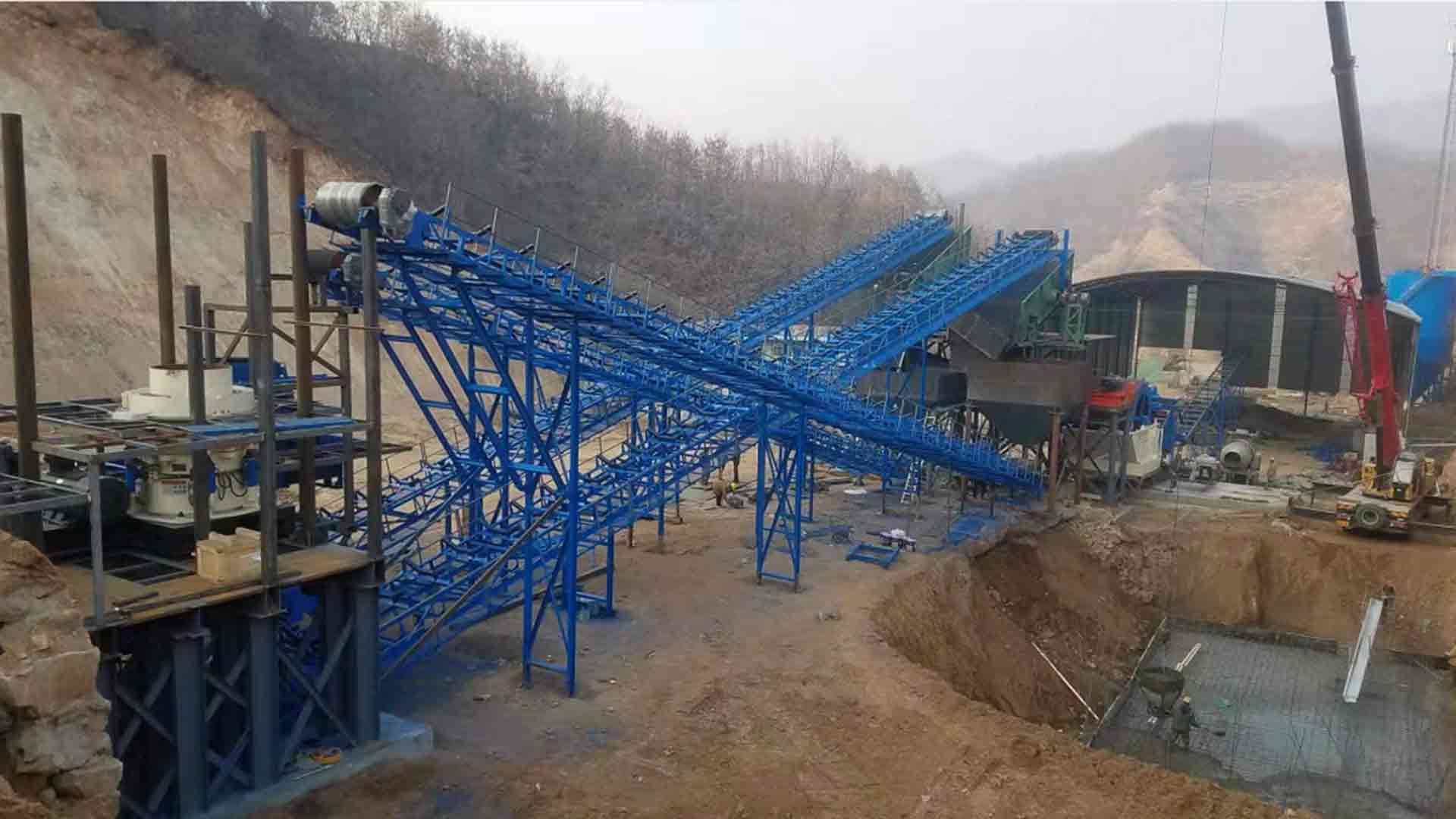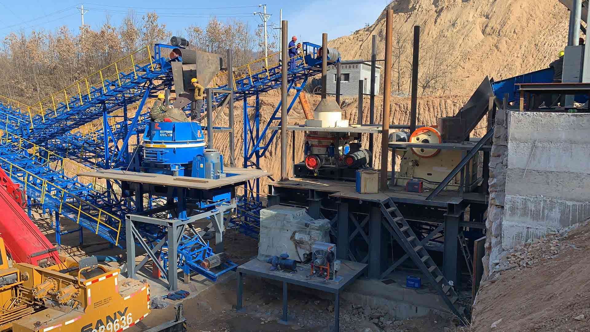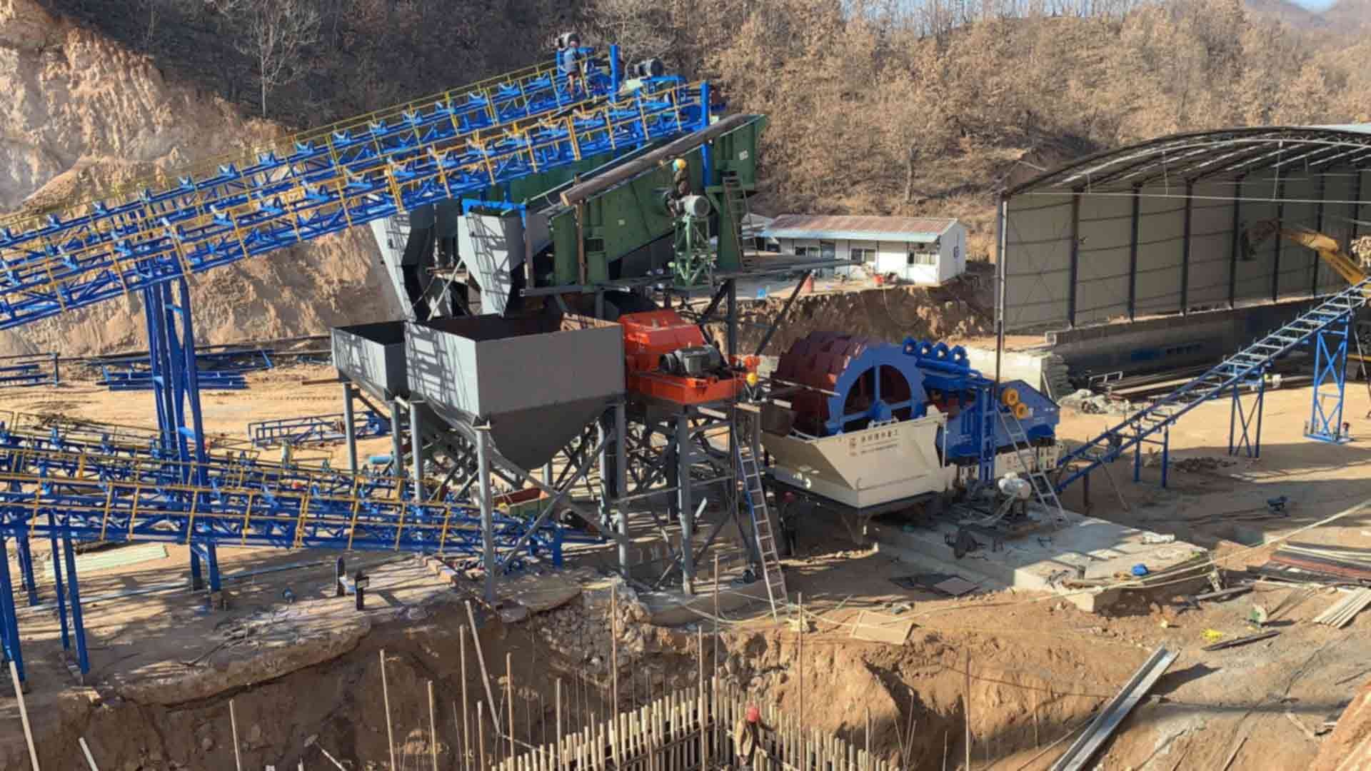 設(shè)備配置:喂料機(jī)、顎式破碎機(jī)、圓錐破碎機(jī)、振動篩、制砂機(jī)、洗砂機(jī)、污水罐